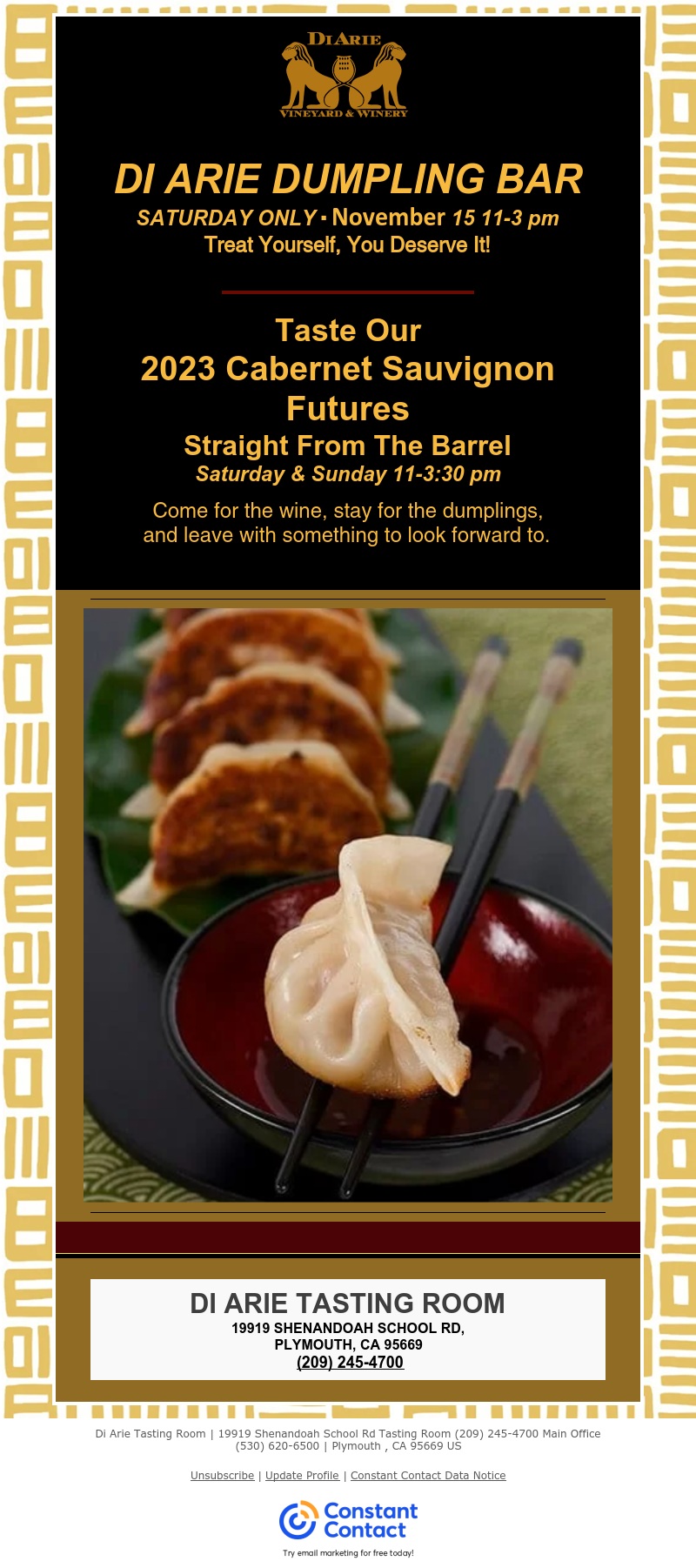 DI ARIE DUMPLING BAR SATURDAY ONLYÙ 11-3 pm Now Indoors – Rain or Shine! Taste Our 2023 Cabernet Sauvignon Futures Straight From The Barrel Saturday & Sunday 11-3:30 pm Come for the wine, […] |